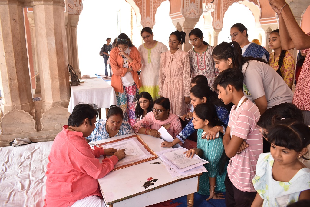 In the one-month cultural heritage training camp being organised by Maharaja Sawai Man Singh II Museum Trust in City Palace, Jaipur, participants are being introduced to the nuances of various traditional Indian arts. The aim of this camp is to introduce the young generation to India’s culture, rich art and craft and to preserve it. Participants of different age groups are participating in the camp and are being provided practical training in various traditional art forms by renowned art experts. This includes traditional painting, Ala-Gila, Araish, Dhrupad, Kathak, Flute, Calligraphy, Vedic astrology and Thikri (mirror work) art. This camp is being organised in collaboration with ‘Rangreet’, a representative organisation of traditional arts, and ‘Saraswati Kala Kendra’. The camp will conclude on 20 June.