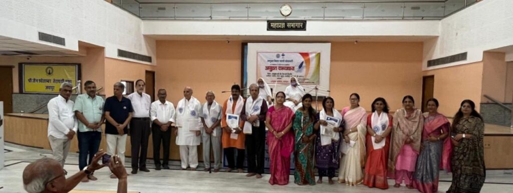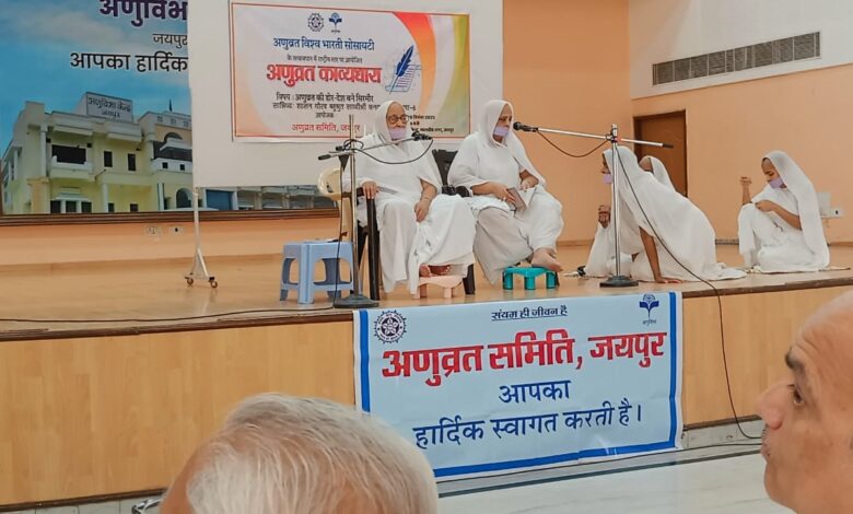 अणुव्रत के सिद्धांतों को जन-जन तक पहुंचाने के उद्देश्य से आज अणुविभा जयपुर केन्द्र में अणुव्रत काव्य धारा कार्यक्रम का आयोजन अणुव्रत समिति जयपुर द्वारा बहुश्रुत परिषद की सम्मानित सदस्या शासन गौरव साध्वी श्री कनकश्री जी के सानिध्य में आयोजित किया गया। जिसका विषय था अणुव्रत की डोर ~ देश बने सिरमौर। अणुव्रत काव्य धारा का उद्देश्य अणुव्रत के दर्शन और इसके सिद्धांतों को काव्य पाठ के माध्यम से प्रचारित व प्रसारित करना है। इस कार्यक्रम में राष्ट्रीय एवं अंतरराष्ट्रीय ख्याति प्राप्त कवि, रचनाकार, लेखक एवं साहित्यकार आमंत्रित किए गए । कार्यक्रम में कुल 11 रचनाकारों ने अपनी प्रस्तुति दी तथा अणुव्रत आचार्य संहिता के ग्यारह नियमों को काव्य पाठ के माध्यम से समझाने का प्रयास किया। कार्यक्रम का शुभारंभ साध्वीश्री कनक श्री जी एवं साध्वीवृंद ने नमस्कार महामंत्र के पावन उच्चारण के साथ की। तत्पश्चात महिला मंडल शहर की सदस्याओं द्वारा मंगलाचरण स्वरूप अणुव्रत गीत का संगान किया गया । अणुव्रत समिति जयपुर के अध्यक्ष श्री विनोद जी बैद ने अणुव्रत आचार संहिता का वाचन किया जिसे महाप्रज्ञ सभागार में उपस्थित सभी सहभागियों ने दोहराया। आमंत्रित अतिथियों का स्वागत अणुव्रत समिति के निवर्तमान अध्यक्ष श्री विमल जी गोलछा ने करते हुए बताया कि जयपुर अणुव्रत समिति द्वारा प्रत्येक वर्ष काव्य धारा का आयोजन किया जा रहा है तथा इस क्रम में यह चौथी काव्य धारा है । कार्यक्रम में संभागी बने रचनाकारों ने आचार संहिता के 11 नियमों पर अपनी काव्य रचनाएं प्रस्तुत की तथा प्रत्येक संभागी ने आचार संहिता के एक नियम को अपनी अभिव्यक्ति प्रदान की । सम उपस्थित रचनाकारों एवं साहित्यकारों में डॉ मधु भट्ट तेलंग, श्रीमती सोनू यशराज, श्री ललित अकिंचन, श्री सुभाषचन्द्र शर्मा, डॉ. राधेश्याम भारतीय, डॉ. क्षिप्रा नत्थानी, श्रीमती अंशु हर्ष, रेनू शब्दमुखर, योगाचार्य डॉक्टर नरेंद्र शर्मा “कुसुम” एवं डॉक्टर रेखा गुप्ता प्रमुख थे । साध्वी श्री मधुलेखा ने भी व्यसन मुक्त जीवन पर साध्वीश्री कनकश्री जी की सारगर्भित रचना प्रस्तुत की । सभी कवियों द्वारा प्रस्तुत की गई रचनाओं की उपस्थित श्रोताओं द्वारा भूरि भूरि प्रशंसा की गई। श्री जैन श्वेताम्बर तेरापंथी सभा के अध्यक्ष श्री शांतिलाल जी गोलछा एवं अणुव्रत विश्व भारती सोसायटी के निवर्तमान राष्ट्रीय अध्यक्ष श्री अविनाश जी नाहर ने भी अपने विचार रखे। श्री अविनाश जी नाहर ने अणुव्रत के विभिन्न प्रकल्पों के बारे में सारगर्भित जानकारी देते हुए अणुव्रत के नियमों को अपनाने के महत्व पर प्रकाश डाला । साध्वीश्री कनकश्री जी ने अपने उद्बोधन में बताया कि जीवन की अनेक समस्याओं को चरित्