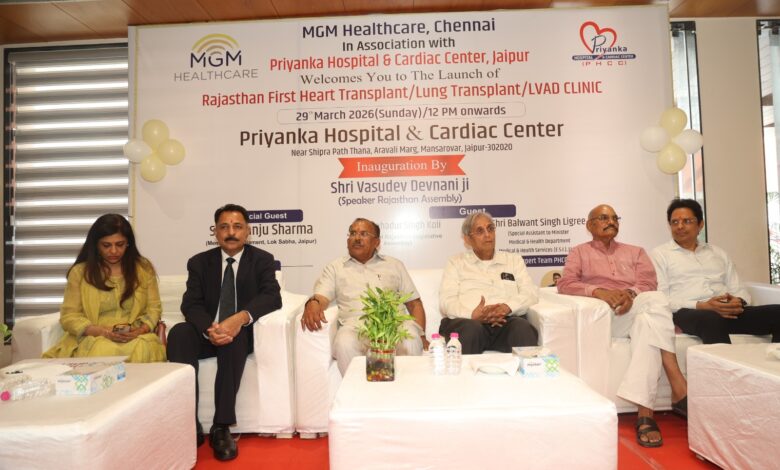 राजधानी जयपुर के मानसरोवर स्थित प्रियंका हॉस्पिटल एंड कार्डियक सेंटर में आज राजस्थान की प्रथम हार्ट एवं लंग ट्रांसप्लांट क्लीनिक का शुभारंभ किया गया। यह पहल MGM Healthcare, Chennai के सहयोग से शुरू की गई है, जिसका उद्देश्य राजस्थान सहित आसपास के राज्यों के गंभीर हृदय एवं फेफड़ा रोगियों को समय पर विशेषज्ञ परामर्श, उन्नत जांच और ट्रांसप्लांट संबंधी मार्गदर्शन उपलब्ध कराना है। इस अवसर पर आयोजित कार्यक्रम में मुख्य अतिथि राजस्थान विधानसभा अध्यक्ष श्री वासुदेव देवनानी रहे। कार्यक्रम में विधायक श्री बहादुर सिंह कोली एवं श्री बलवंत सिंह लांगरी विशिष्ट अतिथि के रूप में उपस्थित रहे।